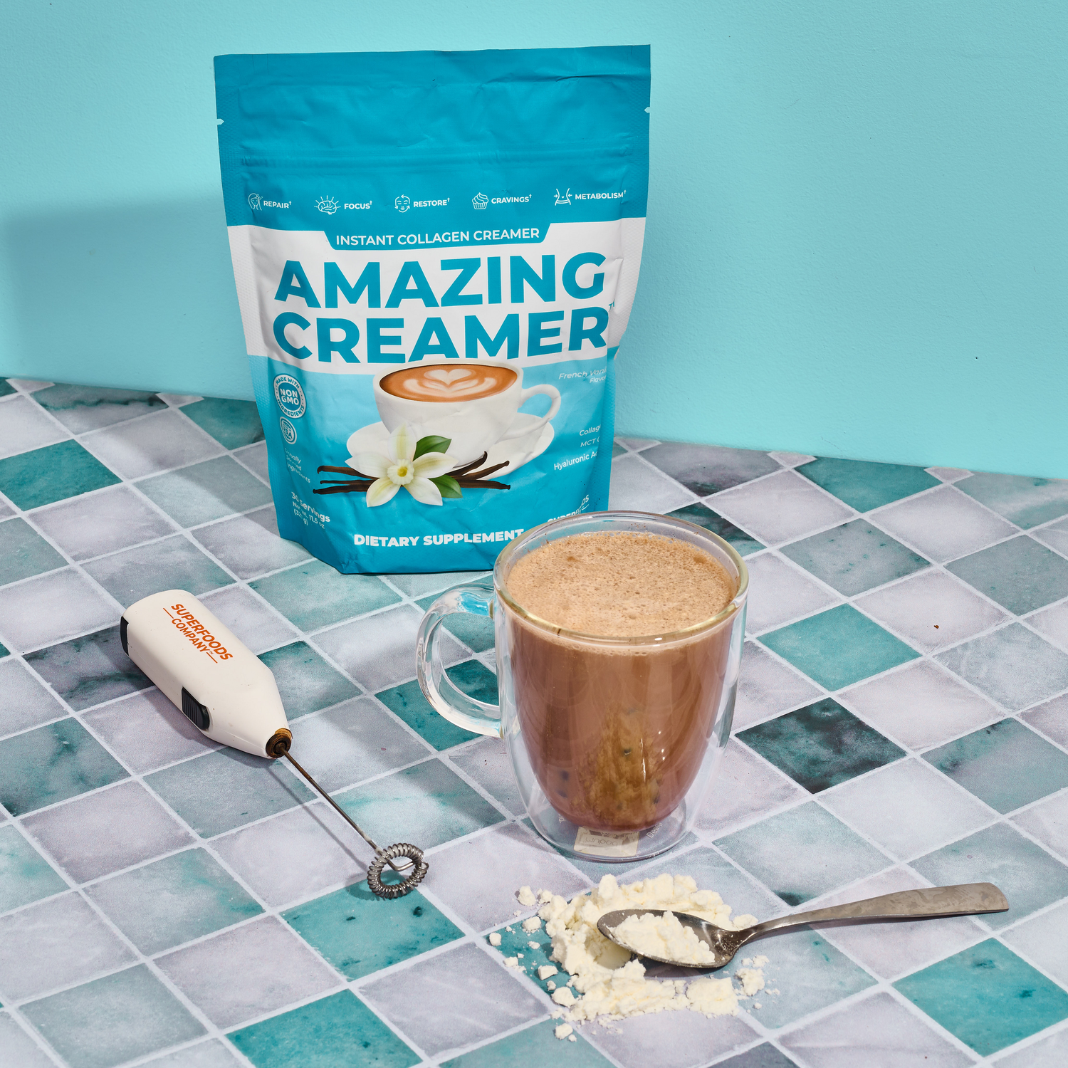 A delicious creamer crafted with collagen, MCT oil, hyaluronic acid, and superfoods. Developed with the help of nutritionists and health experts, it supports your health and anti-aging goals by burning fat for energy, curbing cravings, boosting brain function, fighting wrinkles, and enhancing nutrient absorption.